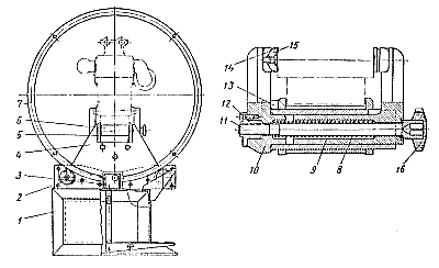 Зажимные устройства представляют собой двухсторонние винтовые прихваты, расположенные по концам соединительных планок. Каждый из прихватов состоит из двух скоб с цилиндрическими хвостовиками, которые входят один в другой. В хвостовике левой скобы 10 имеется прорезь для внутренней правой скобы 9. Таким образом, оба выступающих конца скоб всегда находятся в одной плоскости. К скобам приварены упорные планки 14 с прижимами 15. При вращении маховичка 16 стяжной болт 11 ввертывается во втулку 12 левой скобы, так как последняя, дойдя до упора 13, не может больше повернуться. При освобождении стяжного болта пружина 8 раздвигает скобы, и они могут быть повернуты вокруг болта в нижнее положение.