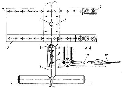 Каретка состоит из стойки 1, поворотной рамы 3 и фиксатора 2. Сварная стойка кантователя имеет подшипники для цапфы 5 поворотной рамы. Поворотная рама представляет собой двойной роликовый транспортер. Каждая из двух его частей имеет 14 роликов 6, которые вращаются на втулках между планками сварной рамы. Боковые накладки 7 и торцовая упорная планка 4 образуют вместе с рамой транспортера одну сварную конструкцию. В нижней части стойки укреплен корпус 8 фиксатора и приварен упор 10 его пружины 9. В сварном основании стойки расположен рычажной привод 11 фиксатора, приводимый в действие от педали 12.