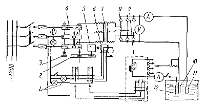 Деталь 10 и анод 11 подсоединяют к источнику тока низкого напряжения. В ванну параллельно детали завешивают датчик (контрольную пластину) 12, активная площадь которого равна 1 дм2. В цепь датчика последовательно включают прибор 9 марки МРЩПр-5. Амперметр этого прибора показывает T ток, проходящий через датчик. При изменении установленной плотности тока срабатывает контактная система прибора МРЩПр-5 и включает реверсивный электродвигатель. Последний через редуктор посредством рейки перемещает ползунок регулятора напряжения до восстановления заданной плотности тока.
