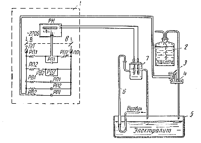 При помощи аэрофильтра 6 электролит из ванны 5 со скоростью 200 мл/мин непрерывно пропускается через датчик 7. Последний посылает электрические импульсы в рН-потенциометр 1. Поценциометр автоматически изменяет кислотность электролита. Если кислотность электролита выше установленной предельной величины, то указатель потенциометра, получив сигналы датчика, замыкает контакты на шкале прибора и через реле РП1 включает соленоид 3. Под действием соленоида открывается зажим 4 трубки бачка 2, и кислота поступает в электролит. Когда кислотность электролита уменьшится до нормального значения, то контакты на шкале потенциометра размыкаются и соленоид снова закрывает зажим трубки бачка с кислотой. Рис. 56. Автомат для регулирования кислотности электролита: 1 — рН-потенциометр СП-рН-2; 2 — бачок; 3 — соленоид; 4 — зажим; 5 — ванна; 6 — аэрофильтр; 7 — датчик; ПП — предохранитель; B — выключатель; РШ и РП2 — реле промежуточное; PB1 и PB2 — реле времени. |