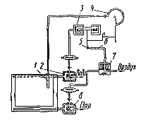 Для автоматического регулирования кислотности электролита применяют специальную установку (рис. 56), которая состоит из рН-потенциометра 1 типа СП-рН-2, датчика 7, аэрофильтра 6, бачка 2 с кислотой соленоида 3 и зажима 4.