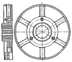 Коленчатый вал дизеля устанавливают так, чтобы его первый и шестой кривошипы заняли верхнее положение (рис. 227, в). Одновременно проверяют соответствие расположения кулачков распределительных валов левого и правого блоков требованиям технических условий (рис. 227, а, б). Затем уточняют в. м. т. поршня первого цилиндра. На шпильки верхнего картера укрепляют стрелку-указатель, а на шлицы переднего конца коленчатого вала — градуированный диск (рис. 228). Рис. 228. Градуированный диск для регулировки газораспределения. |