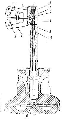 На наружной поверхности диска нанесены риски, соответствующие 1° поворота вала. Против клеима «360°» выбита надпись: BMT1-6Л (верхняя мертвая точка первого и шестого левых цилиндров). Деление диска с клеймом «360°» нанесено на радиусе, проходящем через середину широкой впадины шлицевой втулки диска. Диск располагают на переднем конце вала так, чтобы эта впадина была против шлица, лежащего в плоскости первого и шестого кривошипов. После установки дисков на передний конец вала снимают форсунку первого левого цилиндра. В ее гнездо вставляют прибор для определения в. м. т. (рис. 229). Основной деталью прибора является корпус 10. В отверстии корпуса свободно перемещается стержень 9. На нижнем конце стержня закреплен наконечник 11, который упирается в днище поршня. В прорези корпуса при помощи двух стяжных винтов закреплен кронштейн 1 со шкалой 2; на оси 7 кронштейна укреплена стрелка 3. Короткий конец стрелки проходит в зазор (6+0,08 мм) между стержнем и упором головки. Упор поджимается пружиной 5. Рис. 229. Прибор для определения в. м. т.: 1 — кронштейн; 2 — шкала; 3 — стрелка; 4 — пробка; 5 — пружина; 6 — штифт; 7 — ось; 8 — головка стержня; 9 — стержень; 10 — корпус; 11 — наконечник.. |