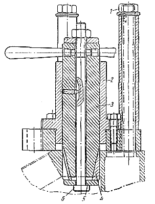Для обработки данных гнезд применяют специальные развертки (табл. 19). При обработке гнезд подшипников наклонного вала привода генератора и нижнего наклонного вала применяют развертки аналогичной конструкции. Гнезда под подшипники наклонных валов развертываются подследующие размеры: 70,15А( + 0,03) или 70,30А( + 0,03) мм. Допустимый диаметр этого отверстия без ремонта равен 70,06 мм. Чтобы обеспечить требуемую точность обработки гнезд подшипников наклонных валов, используют специальный кондуктор (рис. 64). В кондукторную втулку 2 вставляют оправку 3. Цангу 4 вводят в обрабатываемое отверстие и разжимают посредством шайбы 5 и болта 6. Затем кондуктор прикрепляют гайками 1 к картеру, освобождают цангу. Рис. 64. Кондуктор для обработки гнезд подшипников наклонных валиков. |