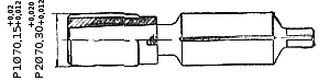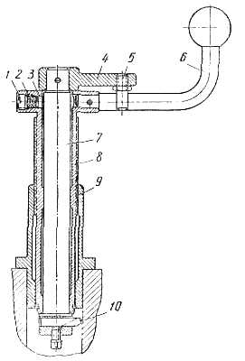 Сухарь 3, резиновый буфер 2 и пробка 1 образуют тормоз, несколько затрудняющий поворачивание оправки 7 относительно эксцентричной втулки 8. Эта втулка ввернута (шаг резьбы 0,5 мм) в направляющую втулку 9 и, кроме того, в нижней части направляется цилиндрическим пояском направляющей втулки. Перед тем как ввести приспособление в гнездо картера, необходимо рычагом 4 повернуть оправку с резцом 10 на 180°. Благодаря эксцентрицитету втулки 8 вершина резца приближается к центру направляющей втулки и не задевает поверхность гнезда. Фланец направляющей втулки посредством шпилек и гаек крепления подшипника наклонного валика привода генератора крепят к картеру. Затем, придерживая рычаг 4, вращают воротком 6 эксцентричную втулку по часовой стрелке. Вершина резца отходит от центра и врезается в материал гнезда. Усилием резания упор 5 прижимается к воротку. Продольная подача (0,5 мм/об) создается благодаря ввинчиванию эксцентричной втулки 8 в направляющую втулку 9. По окончании растачивании резец вновь поворачиваютна 180°относительно эксцентричной втулки и приспособление удаляют из гнезда. Рис. 65. Приспособление для растачивания гнезд. |