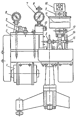 Шпиндель стенда приводится во вращение от электродвигателя 1 мощностью 0,5 квт через бесступенчатый вариатор, расположенный в бабке 3. Поворачивая в горизонтальной плоскости рукоятку 4 вариатора, изменяют число оборотов шпинделя, контролируемое тахометром 6, в пределах от 600 до 1700 в минуту. Квадратный хвостовик приводного валика испытываемого топливоподкачивающего насоса вводят в зацепление со шпинделем стенда, затем насос крепят при помощи струбцин 2 и 15. Вследствие того, что к струбцинам присоединены всасывающий и нагнетательный трубопроводы, происходит одновременное их присоединен к насосу. При испытании насоса топливо к нему поступает из бака через крап 12 и трубопровод 14. Насос нагнетает топливо по трубопроводу 13 в коробку, в которой установлен дроссельный игольчатый клапан 8. Далее топливо через фильтр 5 подается в мерный бачок 10 и через верхний клапан 9 стекает в топливный бак. Дроссельный игольчатый кран служит для создания сопротивления в нагнетательной магистрали. Рис. 212. Стенд для испытания топливоподкачивающего насоса. |