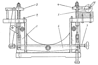 В каждой стойке имеется штифт 2, который входит в отверстие лапы и фиксирует картер. Картер закрепляют двумя эксцентриковыми зажимами 5. При повороте последних посредством коромысла 6 одновременно зажимаются передний 3 и задний 4 прихваты. Тяга 7 служит для перемещения заднего прихвата на лапу картера.