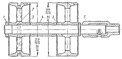 Для проверки соосности привода и установочных поверхностей картера под генератор применяют приспособление, показанное на рис. 186. Оно состоит из вала 2, двух дисков 3, распорной втулки 4, стяжной гайки 1 и муфты 5. Диски приспособления укладывают на лапы картера для крепления геператора. Диаметр дисков равен диаметру опорных поверхностей генератора. Прилегание приспособления к поверхности лап проверяют по краске. Для контроля соосности деталей надвигают муфту приспособления на вал привода генератора. Если детали собраны правильно, муфта свободно перемещается на валу без упора в его торец. Рис. 186. Приспособление для проверки соосности привода и установочных поверхностей под генератор. |