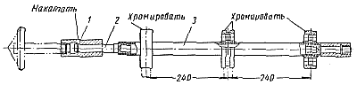 Соосность привода топливного насоса и установочных поверхностей кронштейнов под топливный насос проверяют с помощью аналогичного приспособления (рис. 187). На трубе 3 приварены и совместно обработаны три диска. Они имеют тот же радиус, что и опорные поверхности насоса. В среднем диске расположена кольцевая канавка под скобу кронштейна насоса, по которой определяют положение приспособления по длине картера. На хвостовике 2 сидит муфта 1, которую при проверке соосности деталей сдвигают на вал привода топливного насоса. Если соосность деталей нарушена, производят подшабровку установочных поверхностей генератора или топливного насоса.