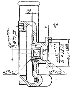 Для предварительного растачивания отверстия до диаметра 21,7+0,1 мм деталь закрепляют на станке при помощи специальной оправки, базируя ее по обработанной торцовой поверхности и выточке во фланце. Затем подрезают торец буртика втулки до размера h = 0,8 мм и снимают фаски 30° и 45° х 1,5 мм. Затем, пользуясь специальным кондуктором, втулку развертывают до диаметра 22+0,45 мм. Биение обработанного отверстия относительно выточки во фланце должно быть не более 0,05 мм.