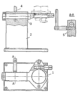 Разборка масляного насоса производится с помощью специального приспособления (рис. 12). Насос устанавливают центрирующим поиском крышки в отверстие разрезного хомута 1. Цилиндрический валик 3 хомута закреплен в стойке 2 винтовым зажимом. При повороте рукоятки 4 дуговые срезы втулок 5 зажимают хвостовик в любом нужном угловом положении. Закрепив насос в приспособлении, вывертывают редукционный клапан, отвертывают гайки болтов и снимают нижнюю крышку насоса. Затем удаляют ведомую шестерню нагнетательной ступени. Рис. 12. Приспособление для разборки и сборки масляного нacoca. |