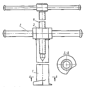 Нa ось ведомой шестерни устанавливают трубчатый корпус 1 съемника. При повороте поводка 2, расположенного в головке 3 корпуса, кольцевой клин корпуса заходит между ведущей шестерней и торцевой поверхностью гнезда в корпусе секции. Таким образом создается необходимый упор в торец шестерни для спрессовывания ее винтом 4. Конец винта упирается в фаску центра ведущего валика.