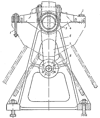 При установке обрабатываемого картера на кондуктор вал 5 с поперечинами 4 ставят так, чтобы базовая плоскость поперечин была обращена вверх. Картер цилиндрическими выточками в торцовых стенках (выполненными в собранном картере) укладывают на шлифованные шейки вала 5. Затем в лапах картера выбирают отверстия с минимальным износом, в кондукторную втулку вставляют установочный болт 1 и затягивают гайку. Второй болт устанавливают в отверстие, расположенное по диагонали. Закрепив картер установочными болтами 1, вал 5 поворачивают так, чтобы он плоскостью разъема был обращен кверху. В таком положении детали вал 5 стопорят фиксатором 8. Для того чтобы окончательно закрепить картер, чтобы снять два установочных болта и развернуть отверстия, нужно на шпильки крепления крышек навернуть гайки 2. Шпильки проходят через отверстия в поперечинах 4. Рис. 67. Кондуктор для обработки отверстий в лапах дизеля. |