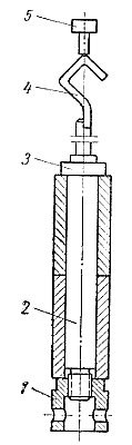 Сначала палец шлифуют на бесцентрово-шлифовальном станке. Овальность и конусность рабочей поверхности пальца после шлифования должны быть не более 0,015 мм. Минимальный диаметр должен быть равен 47,8 мм для пальца старой конструкции и 41,8 мм дли пальца шатуна со штифтами. Наличие рисок и забоин нa поверхности пальца не допускается. В гальваническом цехе пальцы зачищают наждачным полотном зернистостью 120—150 и промывают в бензине, затем устанавливают на подвесное приспособление и тщательно обезжиривают. Подвесное приспособление (рис. 97) представляет собой стержень с крюком и рукояткой; снизу расположена крепежная гайка. Верхнюю часть стержня и гайку изолируют перхлорвиниловым пластикатом. После анодной обработки детали хромируют в сернокислом или в саморегулирующемся высокопроизводительном электролите. Режим хромирования устанавливают для получения осадка молочного вида. Желаемые размеры хромированных деталей приведены в табл. 27; толщина слоя хрома после окончательной обработки рекомендуется не более 0,15 мм. На концах пальцев не должно быть наростов; не допускается отслаивание хрома. Рис. 97. Подвесное приспособление для хромирования пальца: 1 — гайка; 2 — стержень; 3 — шайба; 4 — крючок; 5 — рукоятка. |