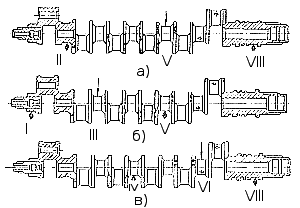 Если прогнуты отдельные участки вала и стрелы прогиба имеют разные направления, то вал правят в два приема. Прогиб передней части вала устраняют, приложив нагрузку к третьей (III) шейке при установке детали на первую (I) и пятую (V) шейки (рис. 108, б). Чтобы выправить вторую половину, вал укладывают на четвертую (IV) и восьмую (VIII) коренные шейки, а нагрузку прилагают к шестой (VI) шейке (рис. 108, в). Рис. 108. Схема правки вала: а - правка при прогибе коренных шеек в одном направлении; б — правка первого учлетка вала; в — правка второго участки вала. |
