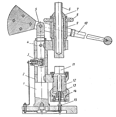 Микрометрическая головка устроена по принципу обычного микрометра. Винт 6 и гайка 7 имеют микрометрическую резьбу. По шкале лимба гайки 7 и риске винта 6 определяют расстояние между плоскостями штока винта 6 и плунжера 11 при крайнем нижнем положении микрометрической головки. Положение гайки 7 по углу поворота фиксируют при помощи маховичка 8.