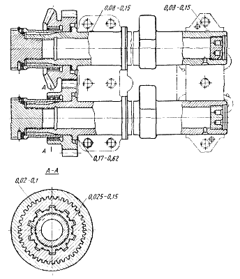 Шестерни на шейке валов устанавливают с зазором 0,02—0,1 мм. Регулировочные втулки подбирают по шестерням так, чтобы обеспечить зазор 0,02—0,1 мм. Те же требования предъявляют к внутренним шлицам втулки и шлицам вала (зазор 0,025—0,150 мм).