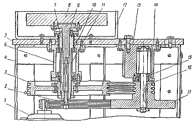 Для притирки торцовой поверхности поршня используют специальный станок (рис. 95). Чугунный притирочный диск 8 крепится болтами к планшайбе 9, конусная часть которой входит в отверстие шпинделя 7. Последний имеет шарикоподшипники 10, установленные в корпусе 6. Между шарикоподшипниками поставлена распорная втулка 11. Корпус 6 крепится к плите 5 сварной станины 4. К плите также прикреплена литая чашка 12. На нижнем конце шпинделя закреплен шкив 3 с клиновидными желобами. Для снятия притирочного диска служит винт 2, который ввертывают в резьбовое отверстие шпинделя.