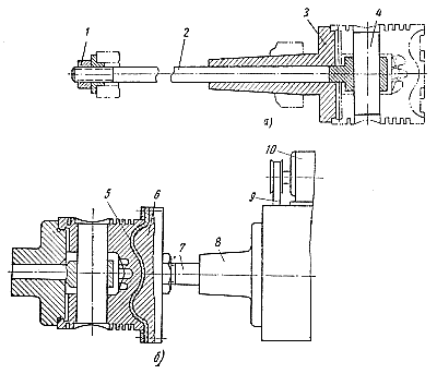 Днище поршня полируют с помощью корундовых паст эластичным полировальником 5 (рис. 96, б) на револьверном станке. Поршень приводится во вращение от шпинделя станка, державка 6 и полировальник 5 приводятся от специального электродвигателя 10, установленного на револьверной головке. Стакан 8 с опорой шпинделя 7 полировального приспособления крепится фланцем к одной из граней головки. Шкивы шпинделя и электродвигателя соединены клиновым ремнем 9. Рис. 96. Приспособление для установки поршня: а — при токарной обработке; б — при полировании днища. |