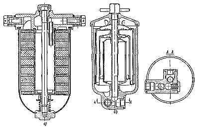 Перед сборкой масляного фильтра детали (рис. 220, б), за исключением фильтрующих секций, промывают дизельным топливом. Для промывки фильтрующих секций применяют бензин. Затем детали обдувают сжатым воздухом и проверяют исправность фильтрующей проволочной обмотки.