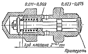 При сборке пускового клапана (рис. 222) необходимо обеспечить плавность перемещения клапана и герметичность его головки. Плавность перемещения клапана определяется величиной зазора (0,011 — 0,009 мм) между отверстием в корпусе и стержнем. Кроме того, учитывают зазор (0,023—0,076 мм) по направляющему пояску.