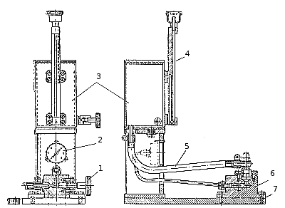 Собранный клапан опрессовывают воздухом под давлением 5 кг/см2. Прибор для испытания пусковых клапанов (рис. 223); состоит из плиты 7, закрытого сосуда 3 емкостью 2 л, ртутного манометра 4, манометра 2, рукава 5, колодки 6 и крана 1. Подготовленный к испытанию клапан ввертывают в резьбовое отверстие колодки, подсоединяют к нему рукав 5 и зажимают колпачком. Стыки между наконечником и деталями кланана уплотняют медноасбестовыми прокладками. Когда кран 1 открыт, сжатый воздух под давлением 5 кг/см2 поступает во внутреннюю полость клапана и, просачиваясь через неплотности между седлом и головкой клапана, проходит в сосуд 3. Клапан считают годным, если за 10 сек. давление в сосуде повышается не более чем на 75 мм рт. ст. Рис. 223. Прибор для испытания пускового клапана. |