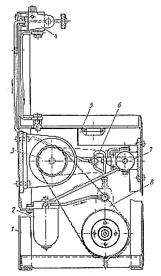 После сборки фильтр в течение 2 мин. испытывают на герметичность при давлении 3 кг/см2. Течь топлива через уплотнения не допускается. Стенд для испытания фильтров (рис. 221) состоит из следующих основных частей: станины 1, топливного насоса 8, электродвигателя 3, топливоподкачивающего насоса 7, топливного фпльтра 2, сборной трубки 6, редукционного клапана, кронштейна 4 для присоединения фильтра и манометра (на фигуре не показаны). Испытываемый фильтр прикрепляют к кронштейну, к входному штуцеру присоединяют трубопровод от сборной трубки, а к выходному привертывают кран для слива топлива из фильтра. Рис. 221. Стенд для испытания топливного фильтра. |