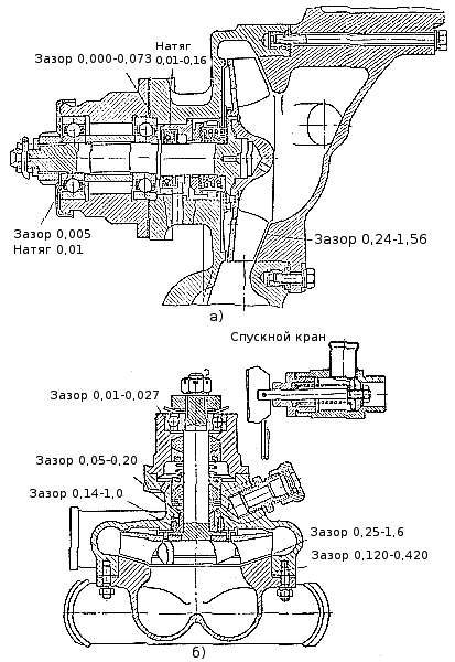 Зазор между наружным кольцом шарикоподшипника и корпусом насоса должен быть в пределах 0,000—0,073 мм, а между шарикоподшипником и валом зазор допускается не более 0,05 мм (в этом сопряжении возможен натяг до 0,01 мм).