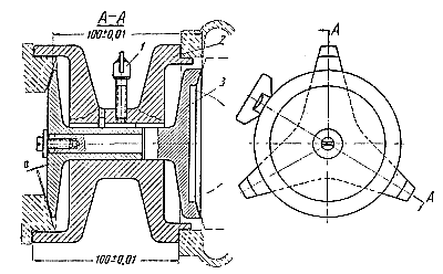 Приспособление устанавливают на плоскость разъема корпуса водяного насоса, а сердечник опускают до соприкосновения конусной поверхности с крыльчаткой. Затем посредством винта 1 фиксируют положение сердечника. Прикладывая к обратной стороне приспособления раструбы, измеряют щупом зазор а между конусной поверхностью сердечника и крыльчаткой. Подобранный (при а = 0,24÷1,56 мм) раструб болтами крепят к корпусу водяного насоса. Рис. 219. Приспособление для подбора раструба. |