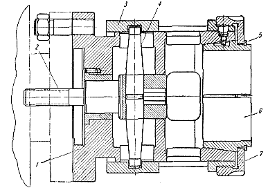 Для создания точной базы при последующей обработке наружную поверхность стакана шлифуют на бесцентрово-шлифовальном станке до диаметра 111,4-0,04-0,075 мм. Затем заготовку устанавливают на токарный станок в пневматический цанговый патрон (рис. 138). Корпус 1 патрона крепится к шпинделю токарного станка, а тяга 2 — к штоку пневматического цилиндра, закрепленного на заднем конце шпинделя. При движении тяги влево усилие передается через поперечину 4 и гильзу 3 к нажимной гайке 7. Цанга 6 перемещается влево и зажимает заготовку. При движении тяги вправо усилие передается через поперечину, гильзу, нажимную гайку и пружинящее кольцо 5. Цанга выдвигается вправо и, разжимаясь, освобождает заготовку. Рис. 138. Цанговый патрон. |