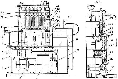 Внутри мензурки имеется стержень 28 ступенчатого сечения. Это позволяет получить более крупные по масштабу деления на участках, где чаще производится отсчет количества топлива. Поэтому обеспечивается достаточно высокая точность градуировки мензурки. Из мензурки топливо через клапан 29 сливается в корыто 30. При нажатии на рукоятку 8 благодаря системе рычагов одновременно открываются клапаны всех мензурок.