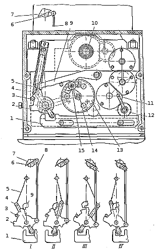 В положении II показан момент включения механизма. Рейка 1 сдвинута влево; при этом рычаг 4 и пружина 5 занимают другое положение. Теперь пружина стремится повернуть рычаги 4 и 2 по часовой стрелке, но они удерживаются собачкой 9. Положение лотков не изменяется.