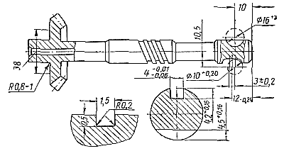 Наплавленную шейку обтачивают до размера 20,5-0,14 снимают фаски 1,5х45° и фрезеруют шпоночную канавку шириной 4-0,01-0,06 мм. Допустимое смещение оси шпоночной канавки относительно оси цилиндрической поверхности 0,06 мм. Затем обрабатывают паз под болт фрезой диаметром 16 мм.