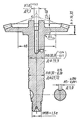 Вал привода топливного насоса (рис. 124) изготовляют из стали 12XH3A. Шейки вала и зубья цементованы. Твердость цементованного слоя HRC≥58. Трещины любого размера и расположения на поверхности детали не допускаются. Выкрашивание слоя цементации на поверхности одного на зубьев допускается на площади не более 6 мм2.
